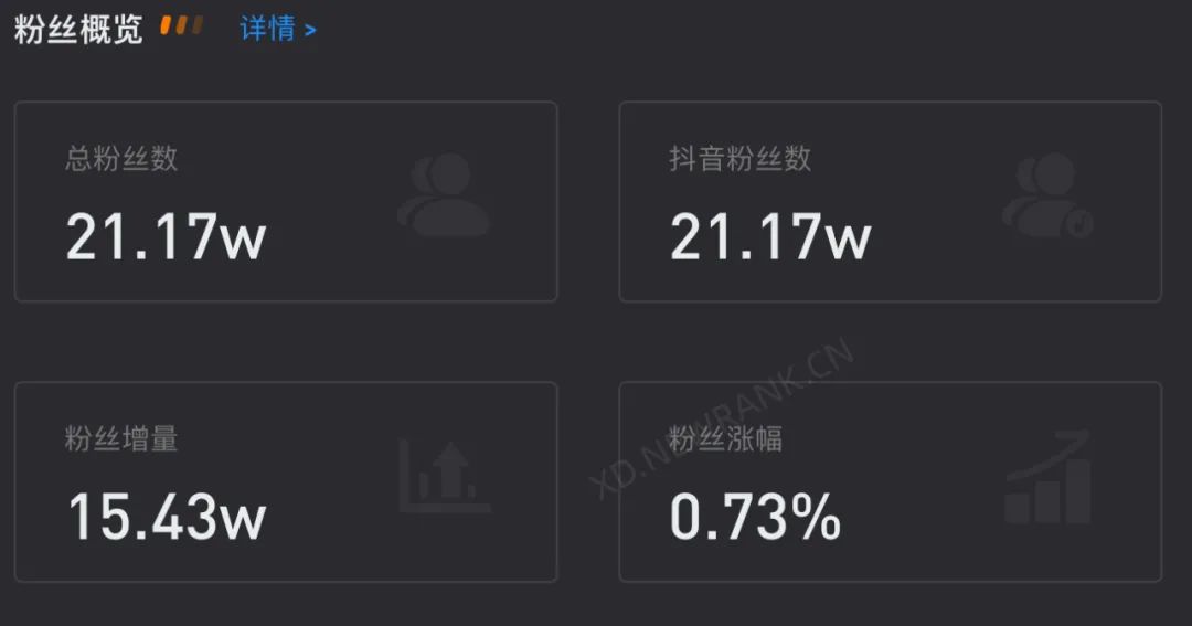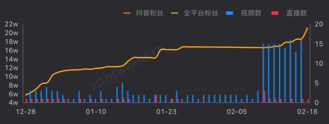 自开播以来,东方甄选粉丝总量为21.17万,粉丝增量15.43万,粉丝涨幅0.73%。整体呈稳定增长趋势,并且过去一周以来,东方甄选明显增加了视频内容量,目前粉丝仍处于上涨期。