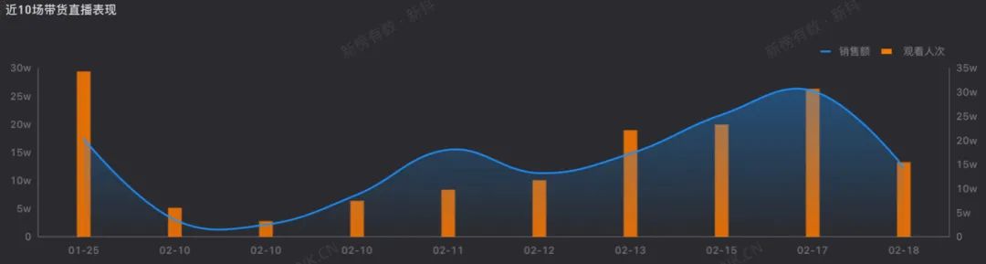 东方甄选过去十场直播汇总,销售额与观看人次并不成正比,整体表现一般。在1月25日、2月10日、2月13日以及2月17日的几场直播中,均出现观看人次高于销售额情况;其中1月25日这场直播观看人次近30万,销售额为20万。