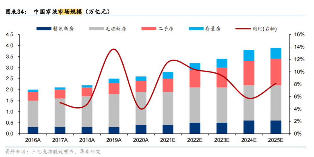 根据华泰证券的数据显示,2015-2019年,我国家装行业的市场规模持续增长,2019年我国家装行业市场规模达到2.74万亿元。