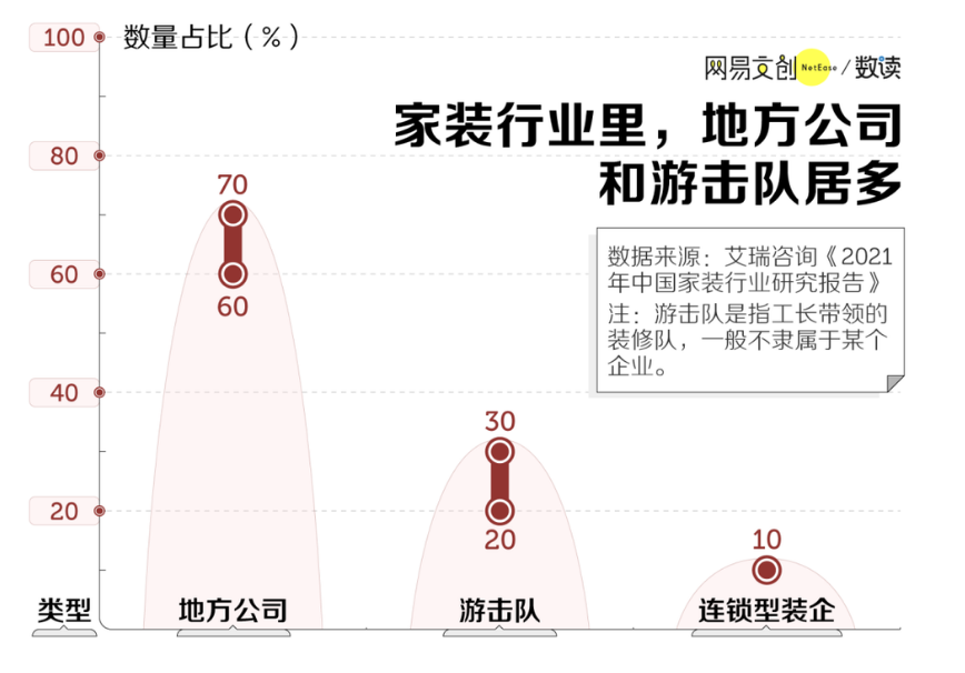 根据艾瑞咨询的调查,中国装修公司大部分都是地方公司和工长带领的装修队,连锁型家装企业的数量占比只有10%,典型的“大行业、小企业”。