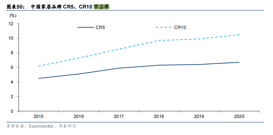 华泰证券的分析员给出了一份中国家居品牌头部市场占有率的图表。2020年家居品牌前五名的市场占有率(CR5)只有6.2%。