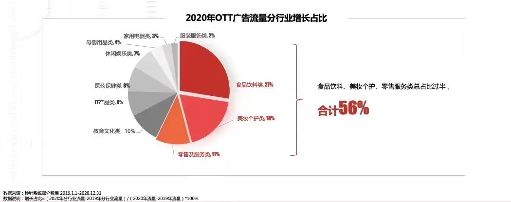 据悉,当前OTT的核心品牌以快消为主,食品饮料、美妆个护和零售服务类三大行业增长明显,总流量增速占比超过一半。![]()