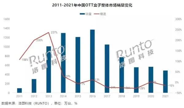 而电视盒子端,据洛图数据显示,2021年中国OTT盒子市场销量为484万台,同比下降15%,市场销量仅为2016年销量峰值1400万台的三分之一。![]()