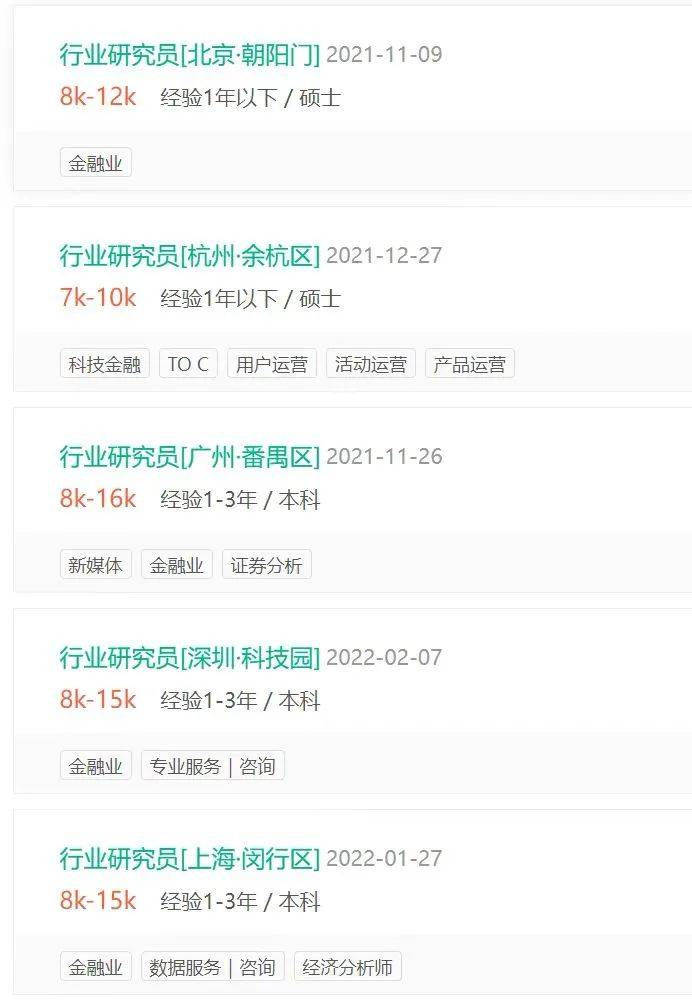 而在拉勾上搜索“行业研究员”,框选1-3年经验,结果显示8-15K每月是主要薪酬区间。