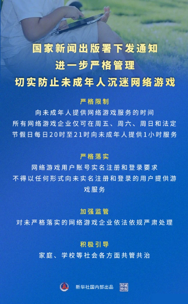2021年8月30日,国家新闻出版署下发《关于进一步严格管理 切实防止未成年人沉迷网络游戏的通知》,要求所有网络游戏企业仅可在周五、周六、周日和法定节假日每日20时至21时向未成年人提供1小时服务,并严格落实网络游戏用户账号实名注册和登录要求等。