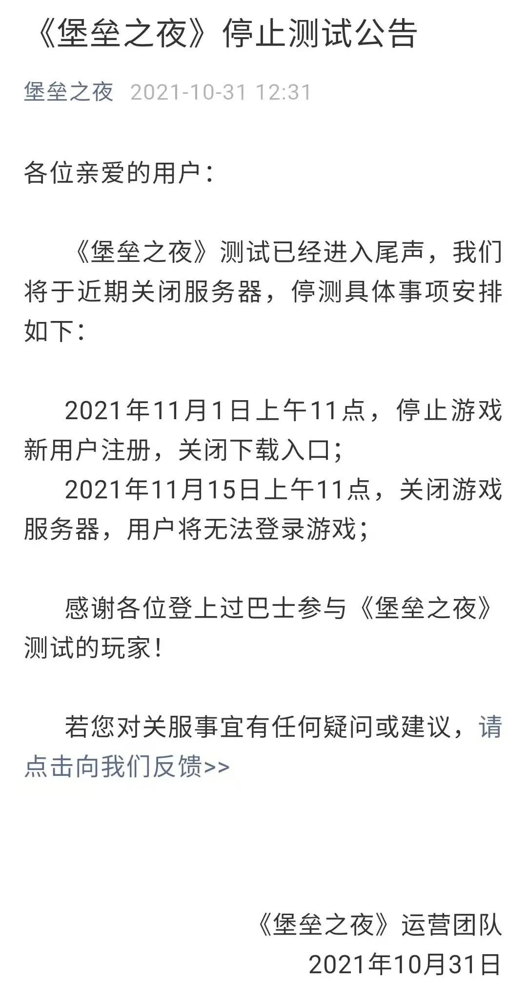 2021年10月31日,《堡垒之夜》官方公众号发布公告,表示游戏测试已经进入尾声,将于近期关闭服务器。这是一款由腾讯游戏代理、Epic Games开发的第三人称射击游戏,在全球范围内都有着广泛影响力,一度堪称品类爆款。