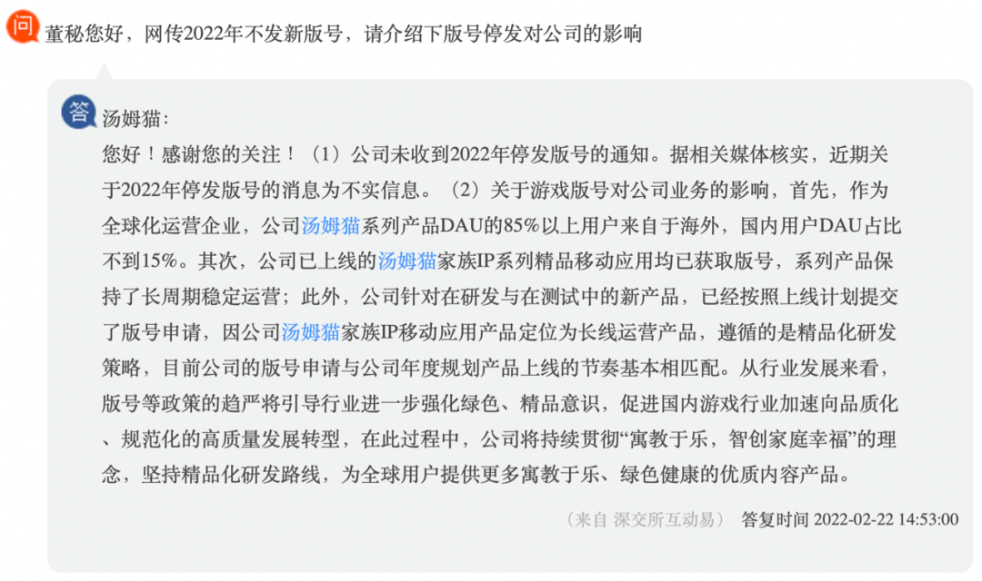 姚记科技则在投资者互动平台表示,公司核心品类游戏版号储备充足,经营业务保持正常稳定。汤姆猫在投资者互动平台作出回复,称“停发版号”为不实消息,侧重解释了全球化与精品化的产品策略,并表示“目前公司的版号申请与公司年度规划产品上线的节奏基本相匹配”。