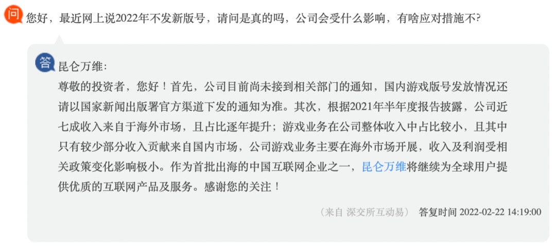 为了提振士气,多家上市公司试图向投资者释放正面信号。2月22日午后,昆仑万维在投资者互动平台发声,一方面对流言作出澄清,表示未接到相关部门的通知,另一方面强调其海外收入的高占比,意在证明整体业务的稳定性。