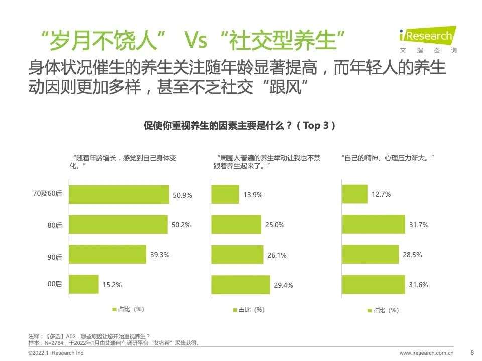 “保温杯里泡枸杞”不是什么新鲜事,新的趋势是“健康”的内涵已经泛化,正如艾瑞咨询《代际人群养生观念差异观察》报告中所提及的,娱乐型与社交型养生是这届年轻人对“健康”的新阐释。