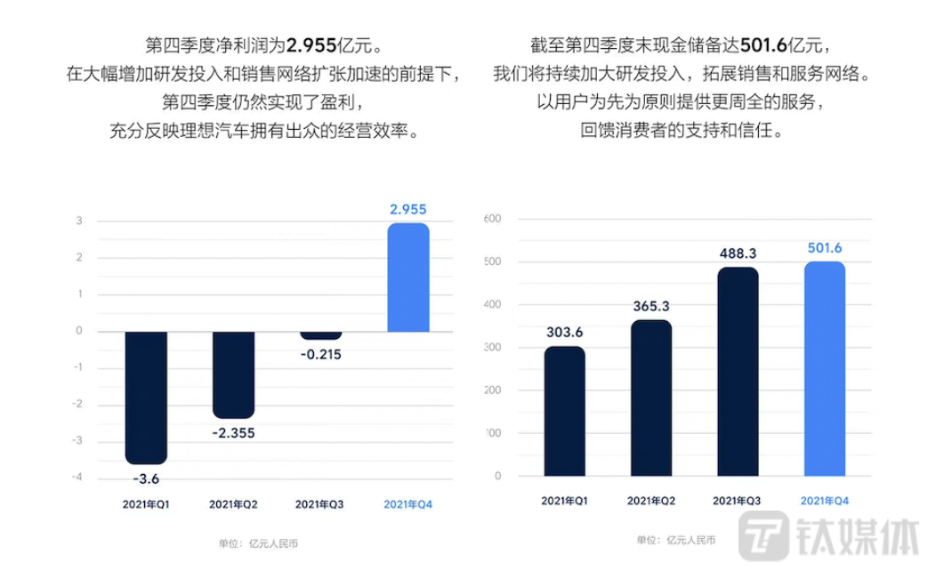 这一季度理想汽车的经营利润为人民币2410万元(380万美元),而2020年第四季度的经营亏损为人民币7890万元人民币,2021年第三季度的经营亏损为人民币9780万元。理想汽车在这一季度的净利润为人民币2.955亿元(4640万美元),而2020年第四季度的净利润为人民币为1.075亿元,2021年第三季度的净亏损为人民币2150万元。