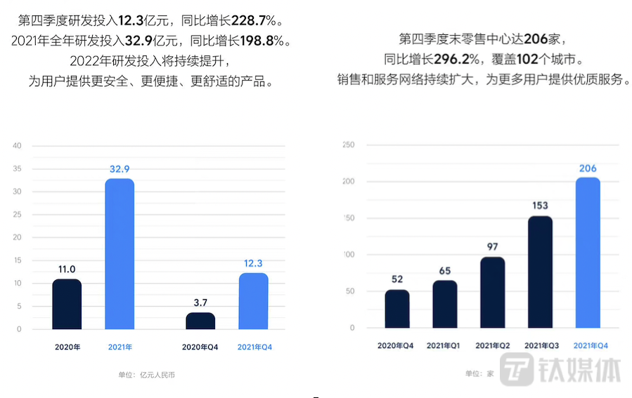理想汽车自成立以来,常年坚持10%以上的研发费用投入。2021年第四季度,理想投入研发的费用为人民币12.3亿元,同比增加228.7%2021年全年,研发费用为人民币32.9亿元,同比增长198.8%。