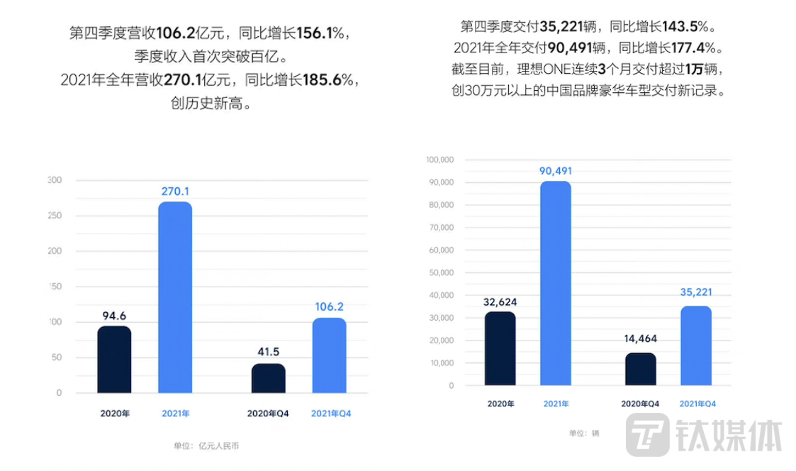 理想汽车于2月25日公布了2021年第四季度及全年未经审计的财务业绩。该季度收入总额达到了人民币106.2亿元(16.7亿美元),季度交付量达到35221辆,季度毛利率达22.4%。2021年全年收入总额为人民币270.1亿元(42.4亿美元),全年交付量为90491辆,全年毛利率为21.3%。