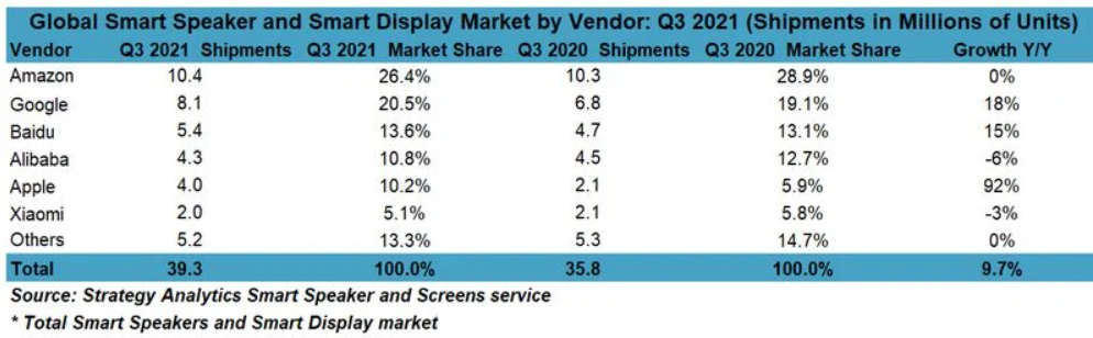 根据Strategy Analytics的最新数据,2021年第三季度智能音箱市场全球出货量总计3930万台,排在前六的品牌分别为亚马逊、谷歌、百度、阿里、苹果和小米。