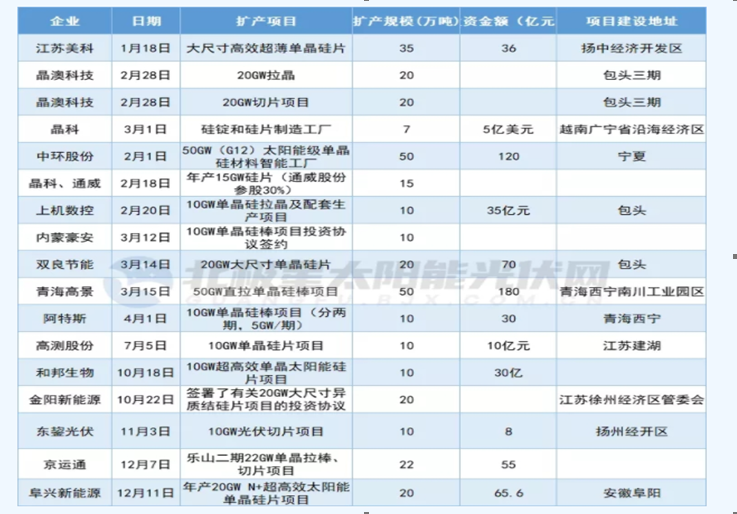 据不完全统计,2021年硅料端扩产164.5万吨,相当于现在产能的两倍,同比增幅超过5倍。若产能释放后可以支撑超过600GW的组件需求。