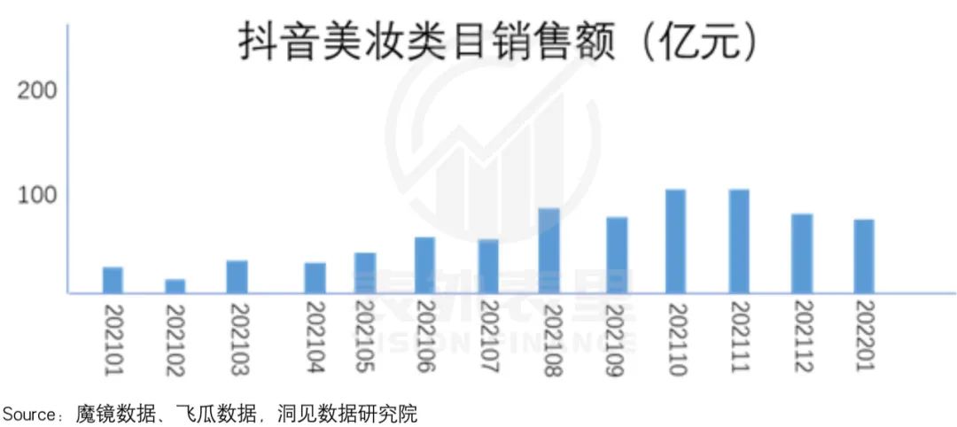 举个例子,在外界认为抖音强势进攻的美妆类目,有统计显示其销售额在2021年12月及2022年1月已连续呈下滑态势。