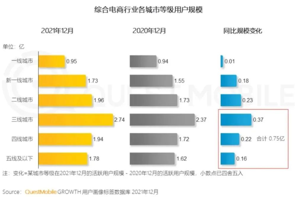 据QM数据,2021年相比2020年,综合电商行业增量用户更多来自下沉地区,三线及以下城市用户的规模增长,对行业增量贡献了超6成。