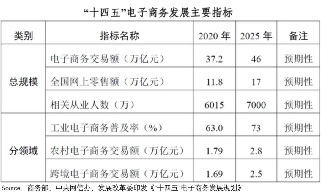 据2021年10月发布的电商发展“十四五”规划,电商行业的预期引导目标是:到2025年,电商要与一二三产业加速融合,中国电商交易额将达到人民币46万亿元;全国网上零售额将达到人民币17万亿元。