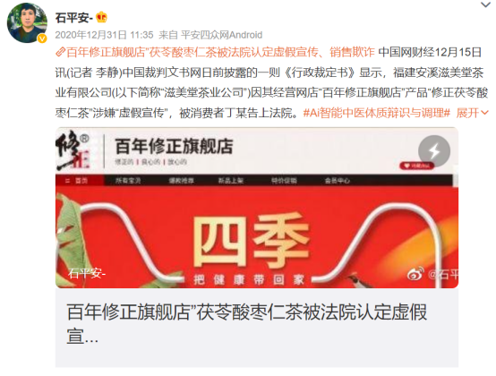 另一个则是修正。中国网就曾报道,被客服介绍为修正集团官方直营商城的“百年修正旗舰店”,所售某款代用茶在详情页面的介绍,存在明显的暗示“助睡眠”“安睡”等功效,使其相信了卖家所宣传的具有改善睡眠的疗效。