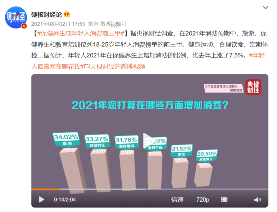 根据央视财经公布的《中国美好生活大调查(2020-2021)》显示,在2021年的消费预期中,保健养生位列18-25岁年轻人消费榜单的第二名,占比33.27%,与比位列第一的旅游仅相差0.75%。