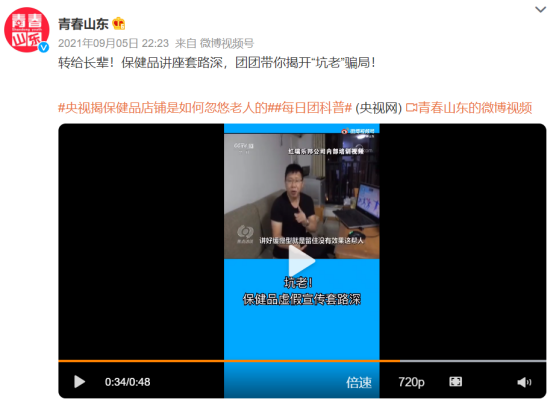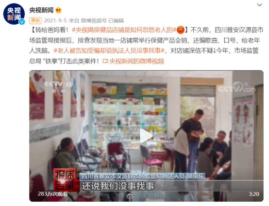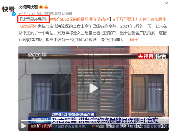 2月,央视网原创资讯短视频栏目《快看》,在其微博官方账号上发布内容,标题便是《比毒品还暴利!售价5000元的保健品进价仅9块》。