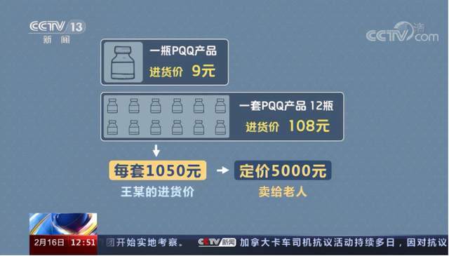 这其实是北京市海淀区人民法院审理的一起真实案件,后经CCTV13央视新闻频道报道。据报道显示,经过相关部门人员的走访调查,一瓶PPQ产品的进货价仅为9元,一套产品是12瓶,即进货价格108元;而讲师团伙拿到该产品的进货价为1050元,最终卖给老人就定价为了5000元。