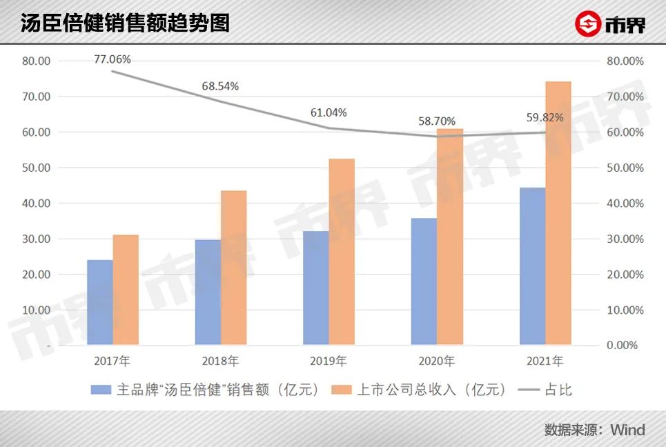 数据显示,2021年汤臣倍健实现收入74.31亿元,同比增长21.93%,归母净利润17.54亿元,同比增长15.07%。
