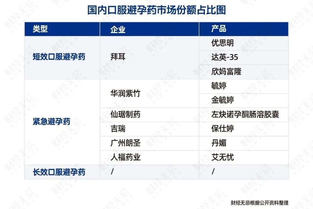 短效口服避孕药中,拜耳“一家独大”,旗下“优思明”、“达英-35”、“欣妈富隆”分别占据女性不同层级的消费市场;在紧急避孕药中,以华润紫竹的“毓婷”和“金毓婷”、仙琚制药的左炔诺孕酮肠溶胶囊、吉瑞的保仕婷、广州朗圣的丹媚、人福药业的“艾无忧”为代表的国产药品占据主要市场;长效口服避孕药仅占极小部分销售额份额。