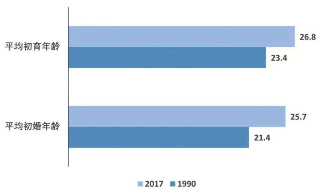 过去的30年,中国育龄妇女的平均初婚、初育年龄明显推迟。根据统计数据显示,育龄妇女平均初育年龄从1990年的23.4岁提高到了2017年的26.8岁,不到30年的时间里,平均每一位女性的初育时间推迟了超过3岁。