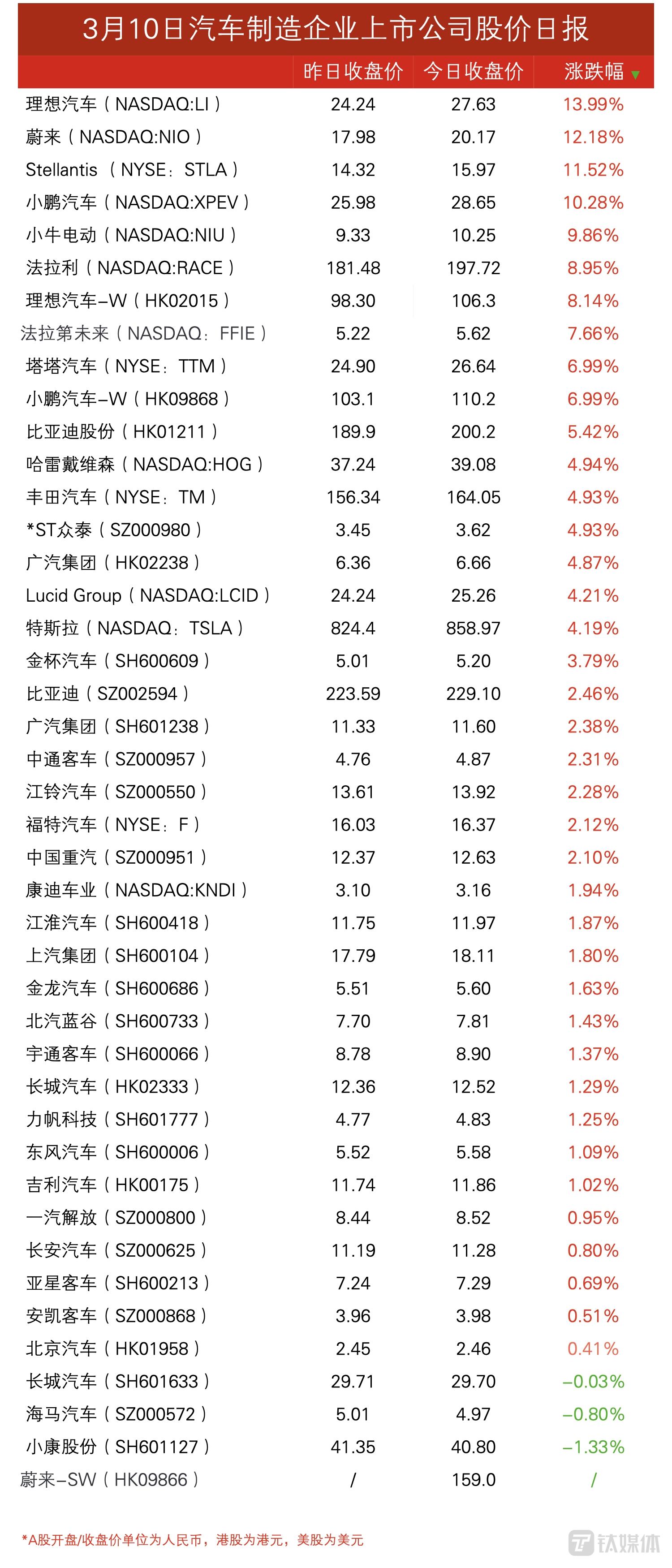 美股领跑,车企股价全面飙红 | 3月10日车企上市公司股价日报