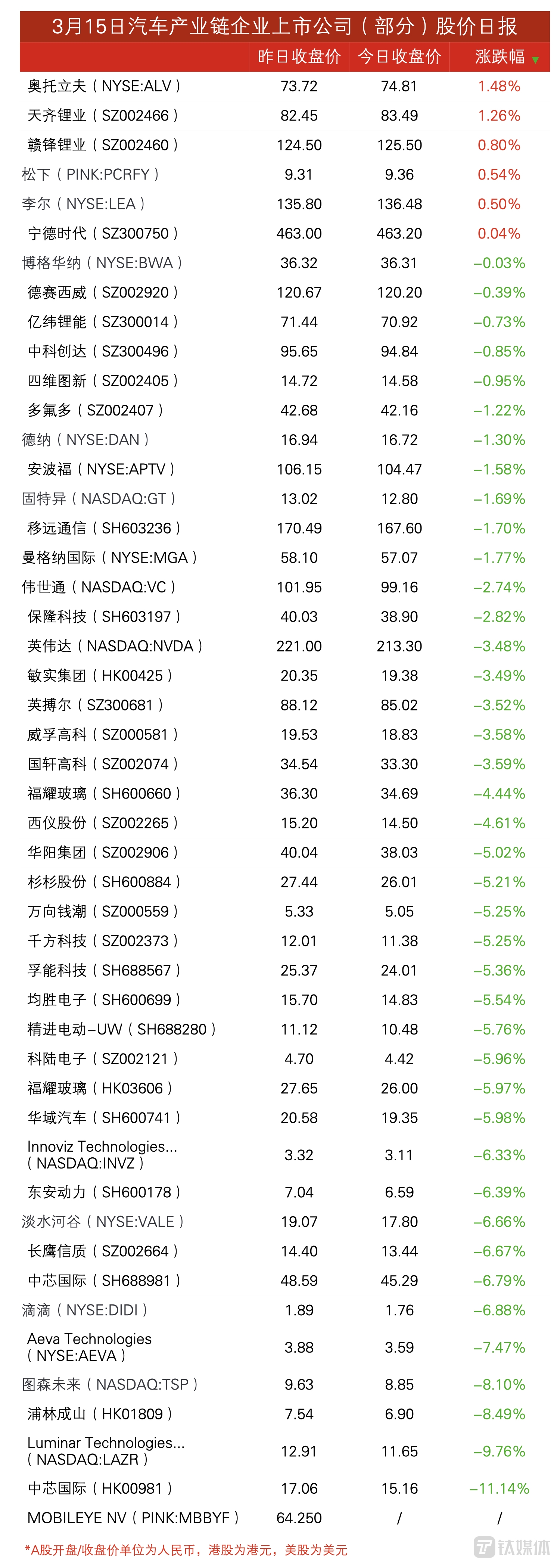 只要跌得少,今天我就敬你是条汉子 | 3月15日汽车产业链上市公司股价日报