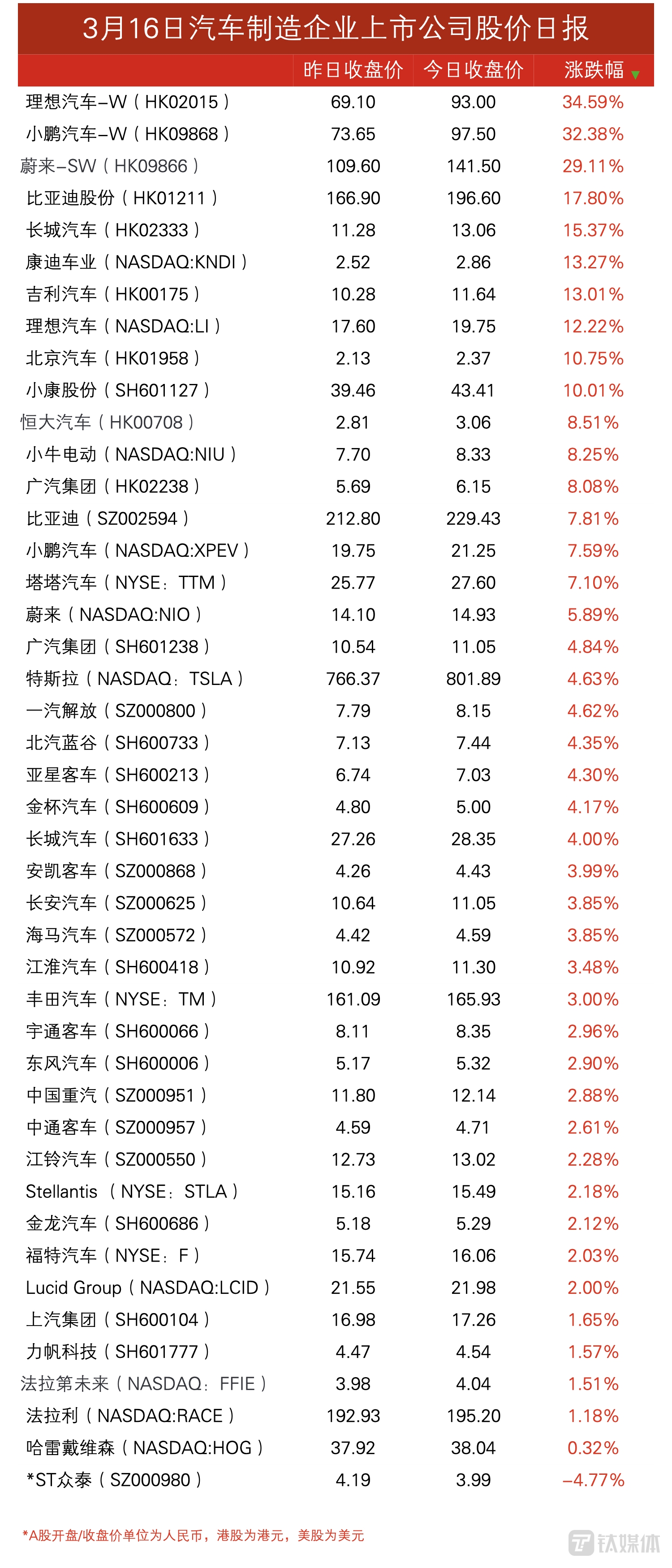 蔚小理港股同涨三成 | 3月16日车企上市公司股价日报