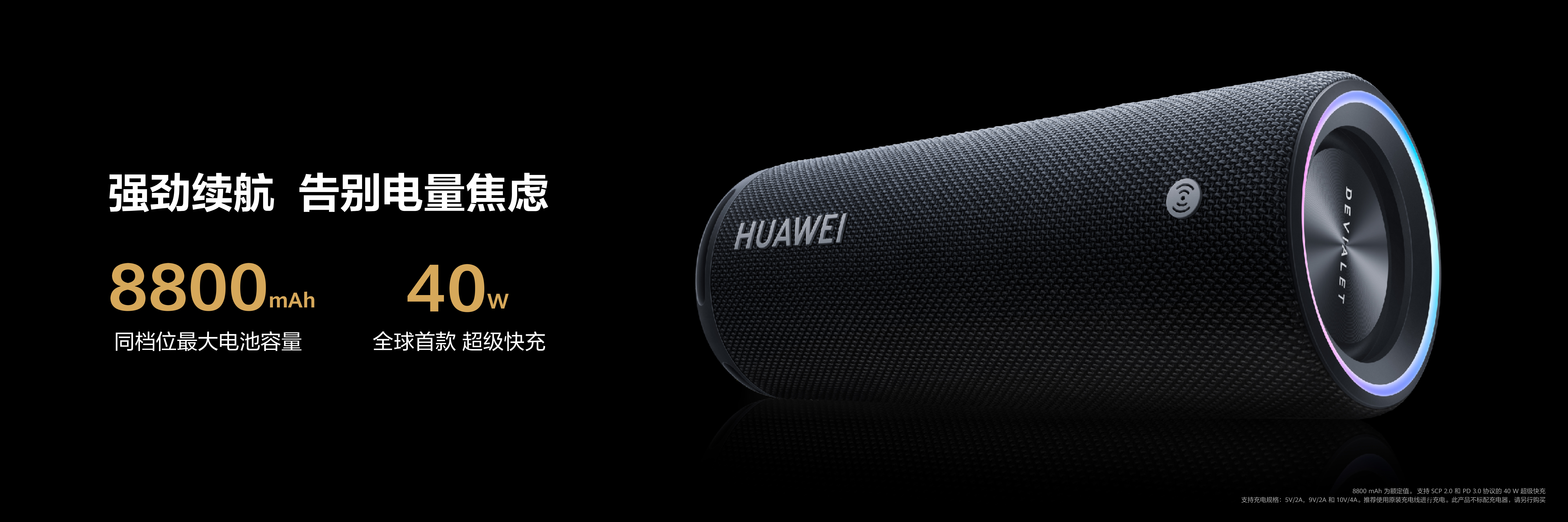 便携智能音箱华为Sound Joy搭载8800mAh容量电池,支持40W快充,能够实现26小时续航,音质上则采用了帝瓦雷四单元二分频声学系统。此外,华为Sound Joy还是首款搭载HarmonyOS 2的便携智能音箱,当部分华为手机、平板、PC靠近能自动发现附近音箱,弹出卡片,一站式完成连接。