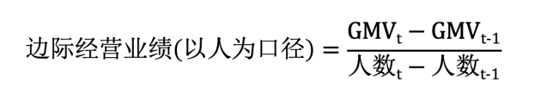 数据不说谎,人效指标是组织能力的最佳代言,是验证组织模式优劣的关键指标。这里,我们不妨再考虑一个穆胜咨询定义的人效类指标——边际经营业绩(以人为口径),简单说,就是每追加一个人,能够带来多少的GMV/营收。具体公式如下: