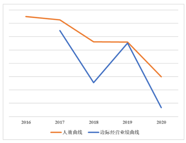 可以说,相对传统人效指标,这个指标更灵敏地指示了人效的变化趋势,而人效又与财效有同向变动的关系,这显然强烈预示了企业未来的财务表现。如图3,腾讯和阿里的边际经营业绩(以人为口径)曲线都呈现下降趋势,且处于人均GMV或人均营收曲线下方,其拖低了人效的趋势明显。