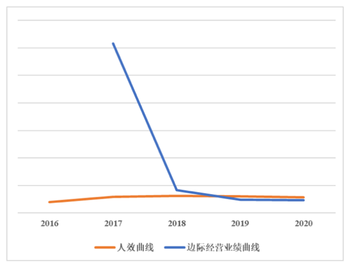 阿里巴巴和腾讯边际经营业绩(以人为口径)和人效变化趋势(2016-2020) 资料来源@阿里巴巴&腾讯财报,穆胜咨询