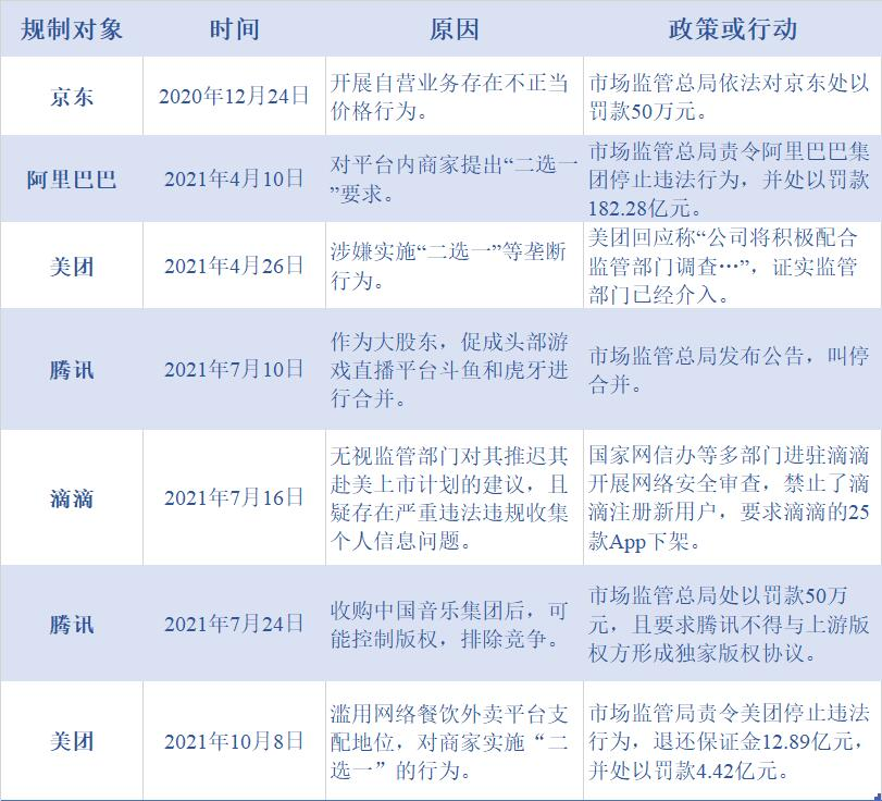 表1:互联网头部企业遭遇的反垄断规制