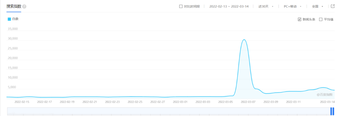 白象意外走红后,关注度随之上升,根据百度搜索指数,白象的相关数据在3月6日当天达到巅峰。