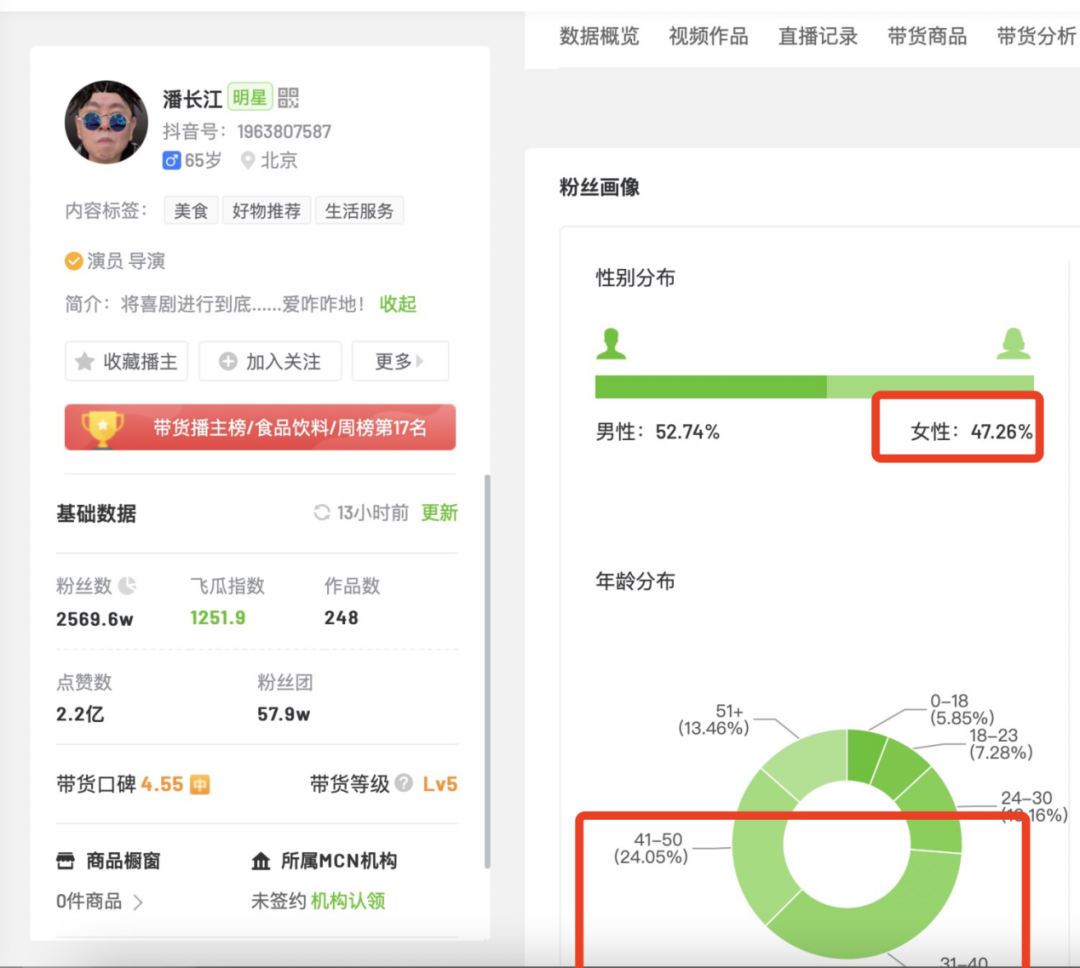 众所周知,白酒的消费人群主要是男性。但剁主观察到,在潘长江的直播间,粉丝画像女性比例达到47.26%,不少粉丝可能并没有对白酒的基本认知。![]()