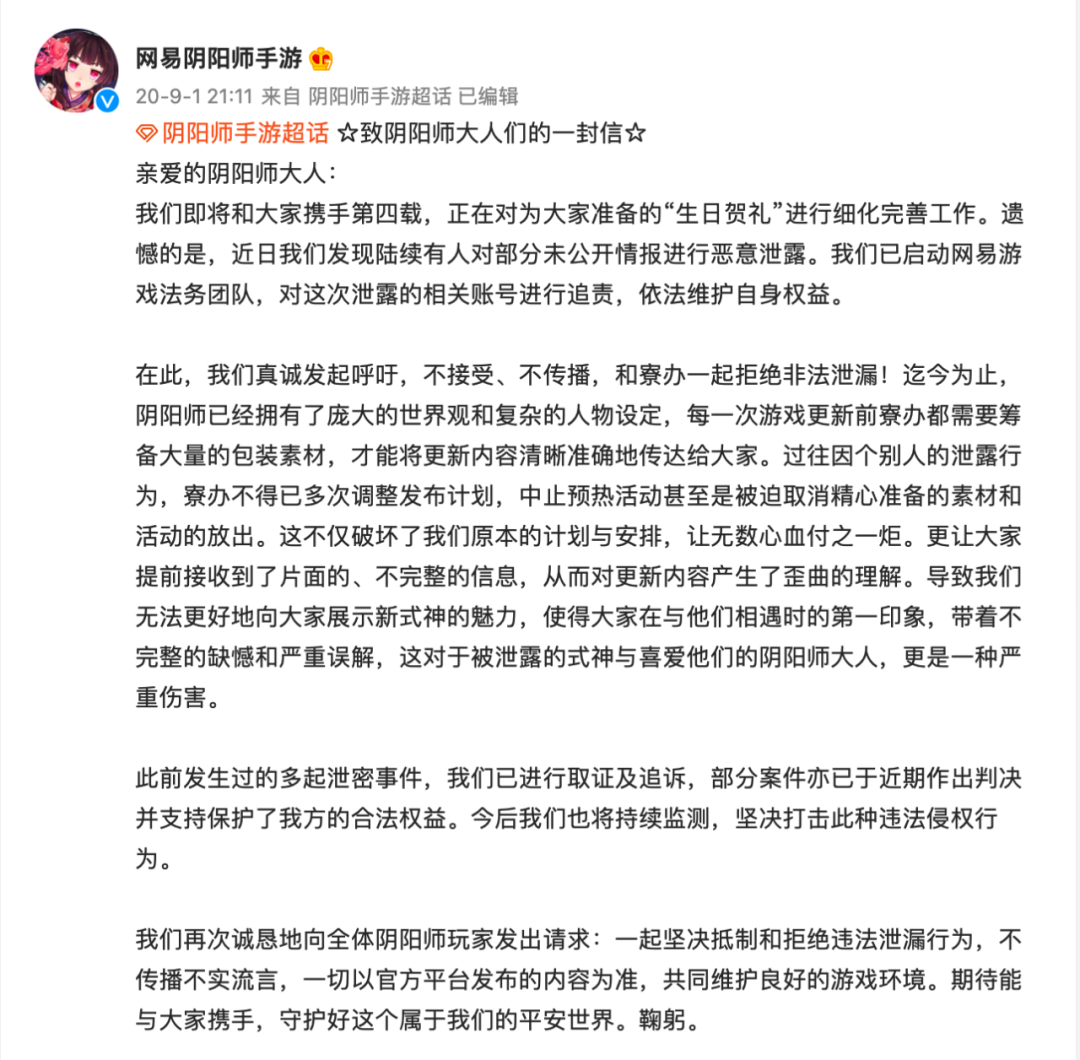 2020 年,阴阳师四周年庆前夕,网络上就流传出阴阳师四周年相关的数据,而网易的处理方式则是在内部处理,并且请求玩家不要传播偷跑信息。