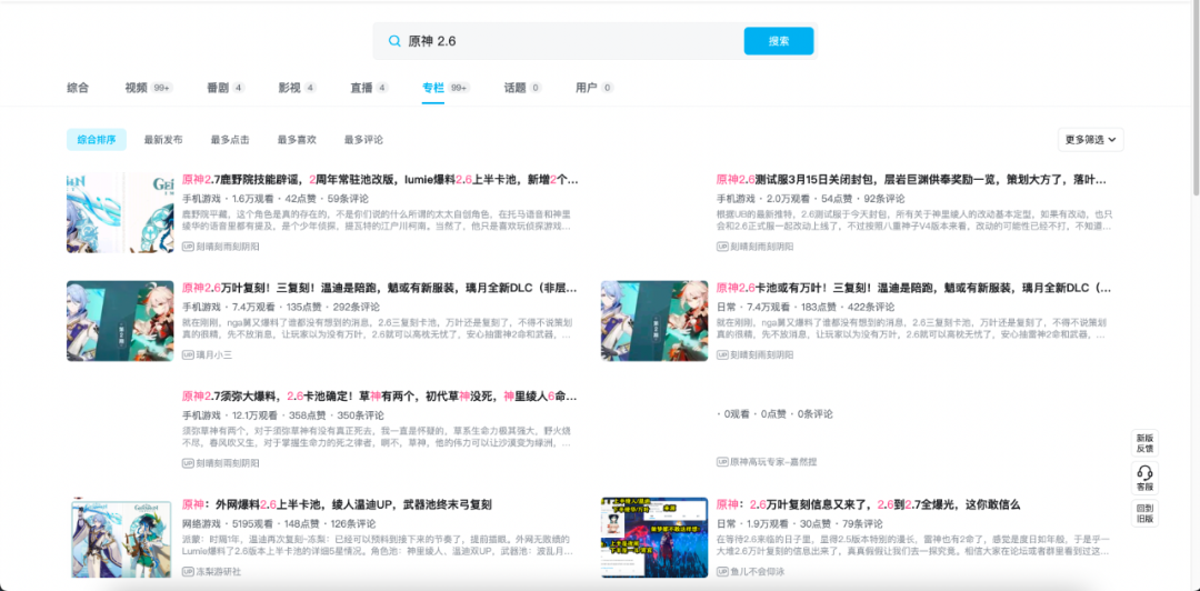 同样是原神,在哔哩哔哩搜索“原神+最新版本号”,相关视频的播放量都非常高,而这些 UP 主仅仅是做了一些简单的搬运工作,类似那些在社交平台上无授权盗搬别人创作内容的营销号。
