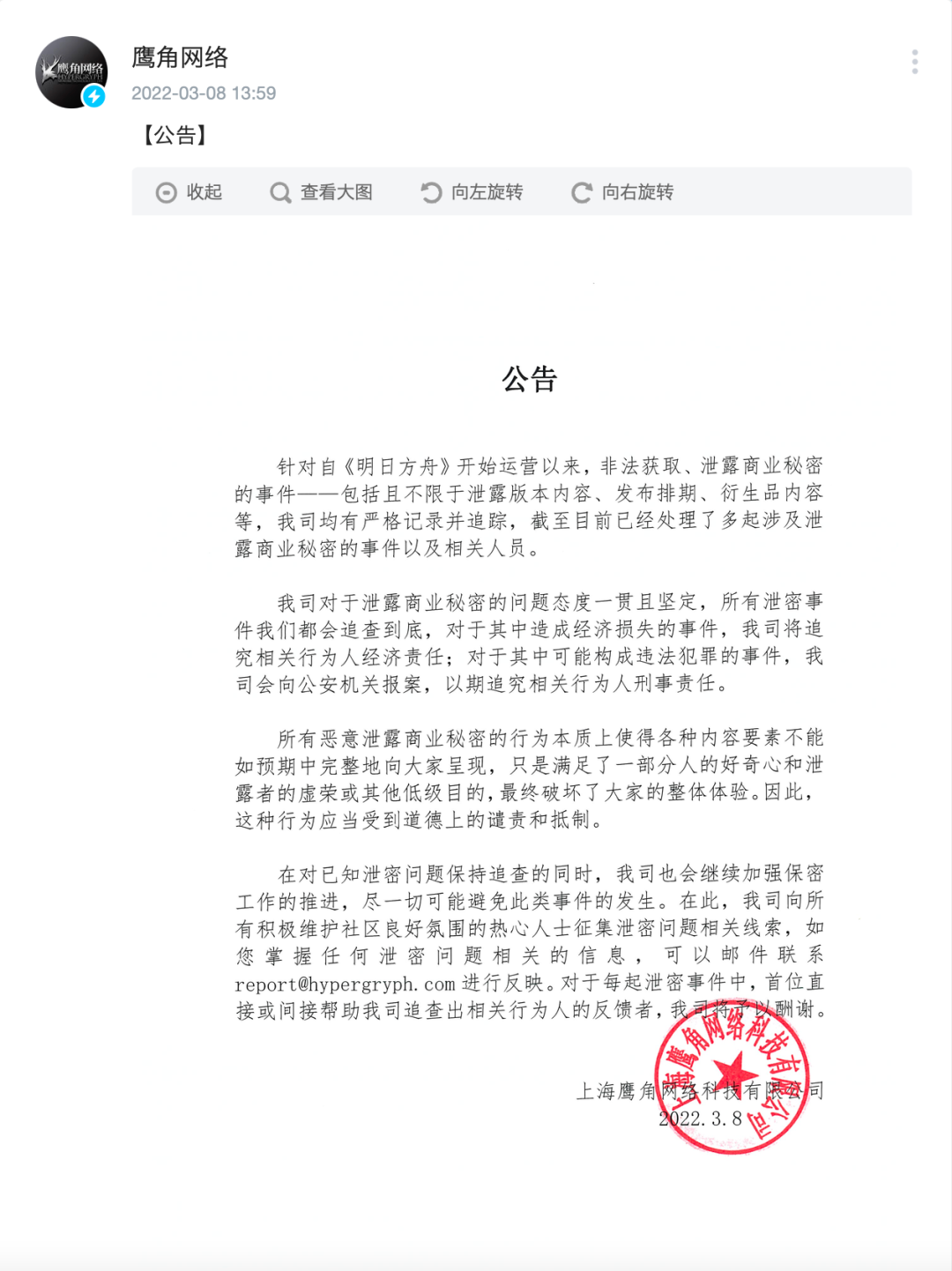 3月8日,鹰角网络官方微博与哔哩哔哩动态发布了一条公告,表示将对此前的恶意泄漏《明日方舟》非法获取、泄漏商业机密内容相关事件的相关人员予以追究法律责任。