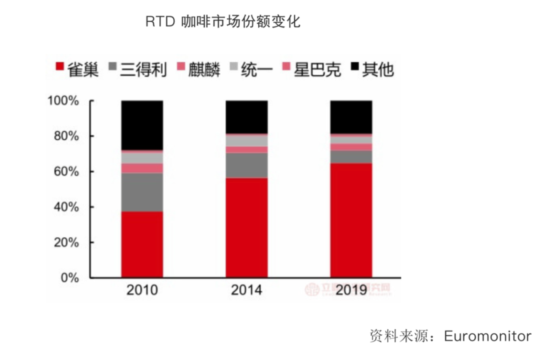 不过,即饮咖啡的市场格局还存在着变数。据立鼎产业研究网报道,经过十年时间的稳定增长,到了2019年,雀巢已经以超过64.8%的市占率处于行业绝对领先地位,但雀巢一家独大的前提是不少国内饮料巨头还尚未入局。