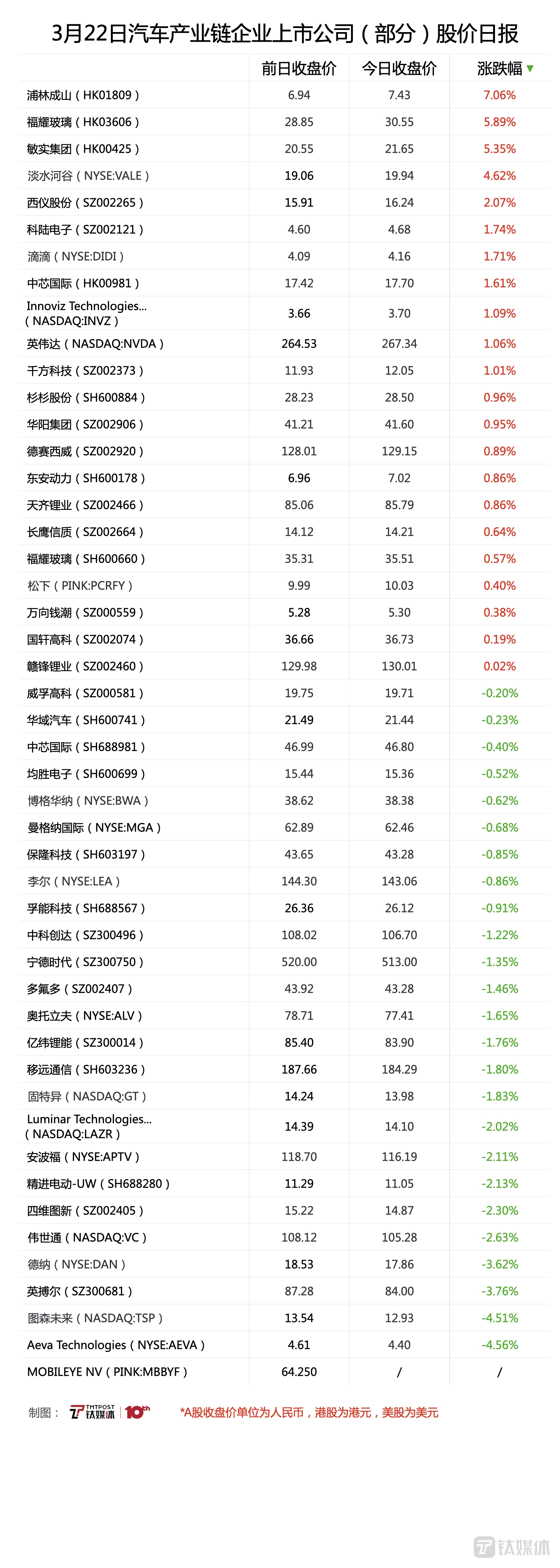 无暴涨暴跌,太平无事 | 3月22日汽车产业链上市公司股价日报