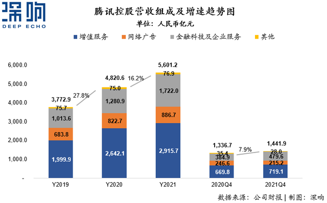 - 腾讯四季度实现营收1441.9亿元人民币,同比增长7.9%,2021年全年营收5601.2亿元人民币,同比增长16.2%。这一增速着实不高,要知道腾讯在2017年的收入可是同比56%的增长,2018年则是增长了32%。