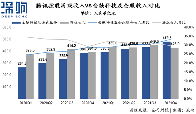 - 2021年四季度,金融科技和企业服务板块的营收同比增长25%,达到了479.58亿元,数实经济收入首度超越网络游戏板块,成为腾讯营收贡献最大的业务板块。