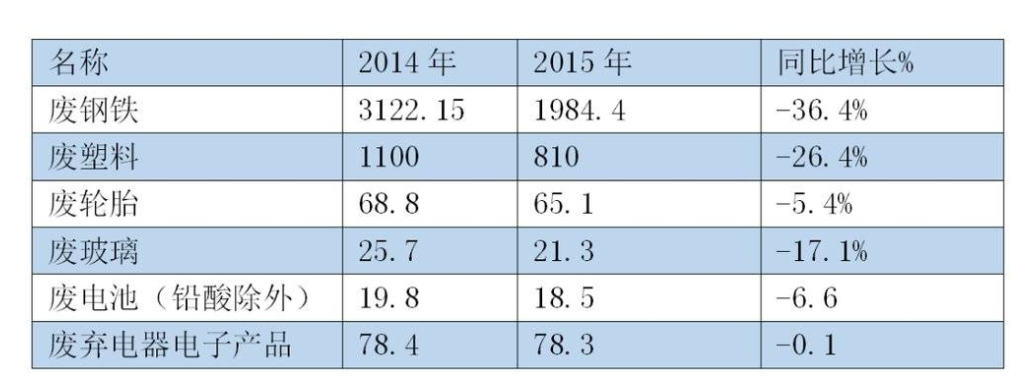 2015年,我国十大品种再生资源回收总值为5149.4亿元,受主要品种价格持续走低影响,同比下降20.1%。其中,废钢铁价格大幅下降,降幅高达36.4%,历史罕见。