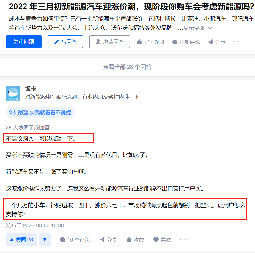 在知乎“2022年三月初新能源车迎涨价潮,现阶段购车你会考虑新能源吗”问题下方,排在最前的高赞回答赢得了不少网友的认可。答主“饭卡”直言,车企是看市场稍微有点起色就想割一把韭菜: