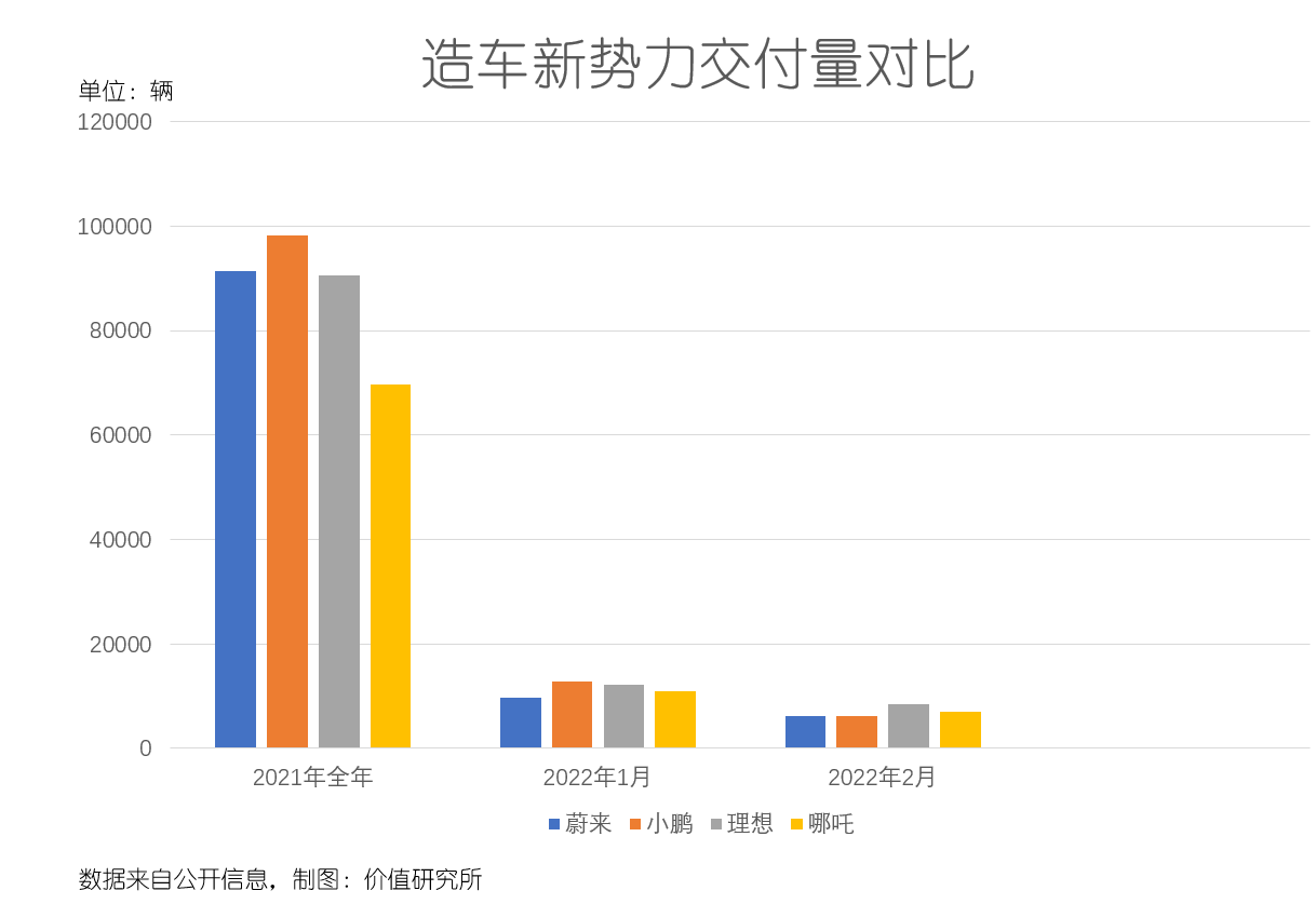 更令人担忧的是,哪吒汽车的崛起之时相当惊人:过去两个月分别交付11009和7117辆,均超过蔚来,2月的交付量同时还超过了小鹏的6225辆,仅次于理想位居第二。过去这些年由“蔚小理”占据第一梯队的造车新势力的权力金字塔,已经出现动摇。