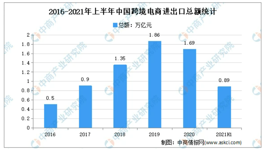 根据中商产业研究院的报告,2020年疫情爆发之后,跨境电商行业反倒被按下加速键。2020年全年,海关跨境电子商务管理平台验放进出口清单达到24.5亿票,同比激增63.3%;处理清单峰值同比翻倍,进出口总额达到8867亿,同比增长28.6%。