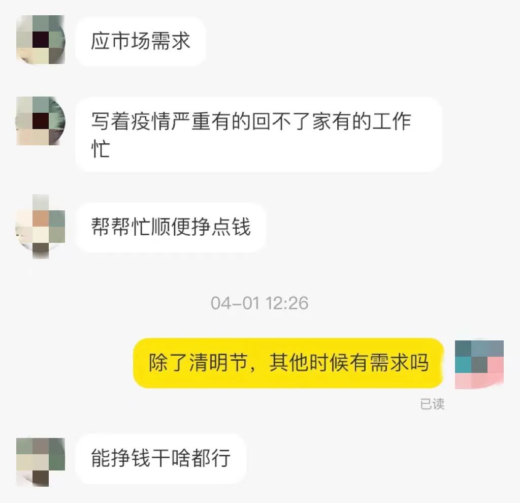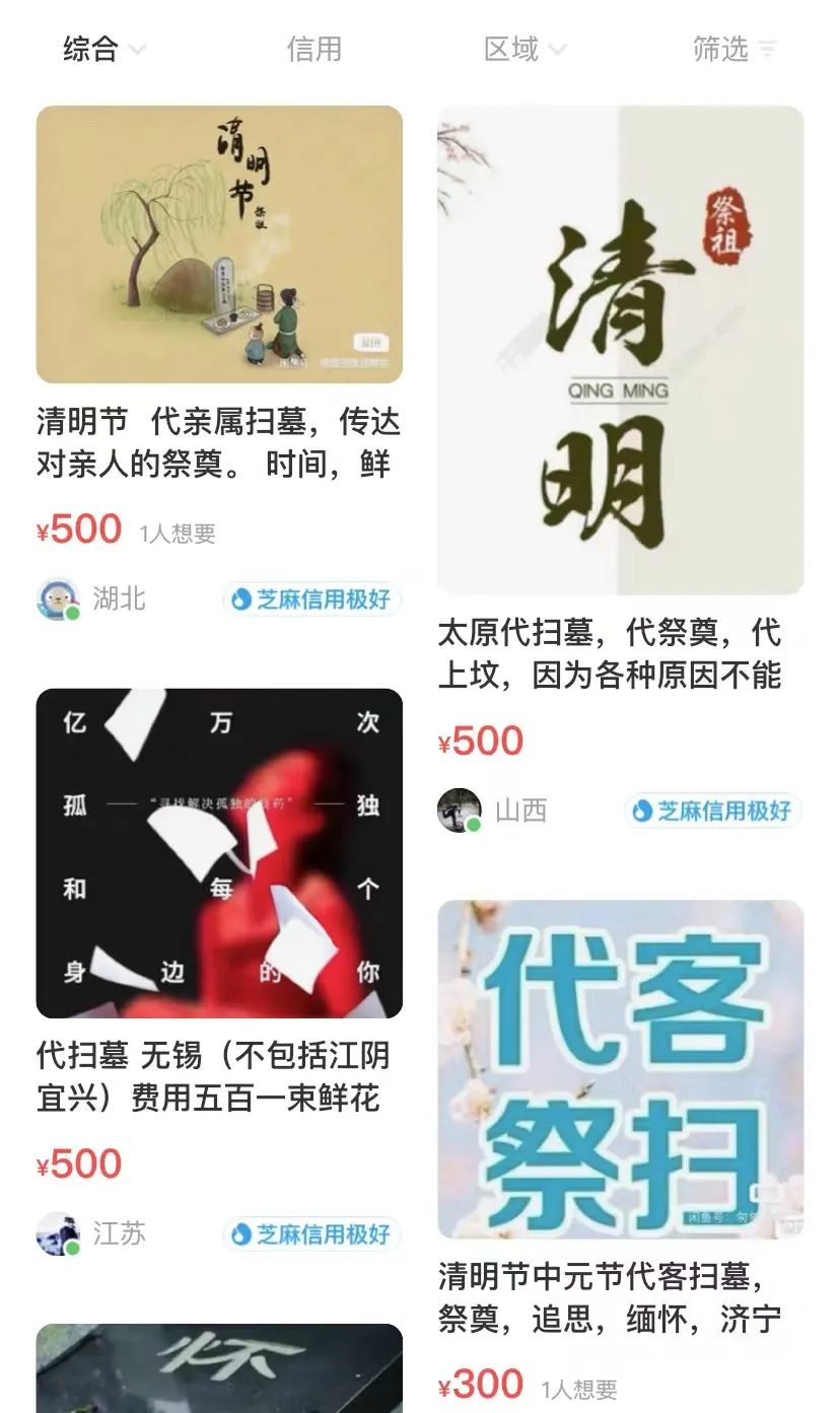 日入两千元,陈明去年的“代扫墓”服务生意不错,但对于个人卖家来说这有运气的成分。今年,他已经发布“代人扫墓”的消息好几天,都没有接到合适的单子。